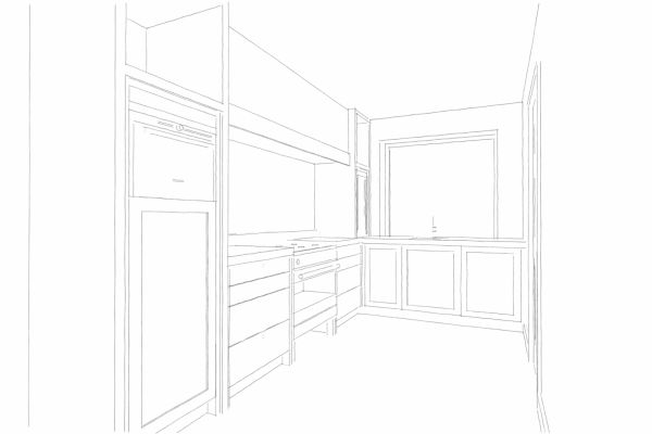 Dat er een RVS fornuis met oven kwam, dat stond vast. Achter het fornuis is tevens een RVS spatwand geplaatst. In deze keuken is gekozen voor een afzuigkap op recirculatie (zonder afvoer naar buiten) Op het aanrechtblad is een vitrinekast met open vakken en met voldoende ruimte voor accessoires, kookboeken etc., geplaatst. Om zowel de hoge kast als om de vitrinekast is lijstwerk aangebracht. Alle inbouwapparatuur is in overleg met de opdrachtgever besteld en aangesloten.
