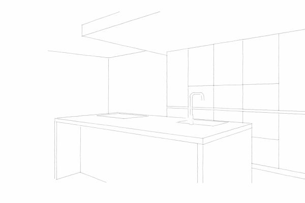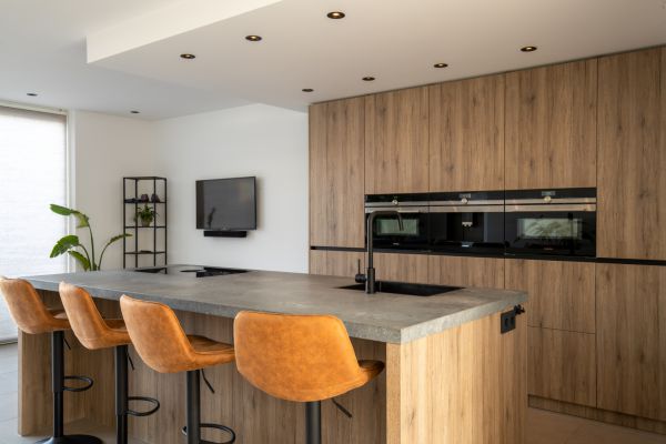 De keuken is zeer ruimtelijk ingedeeld en heeft voldoende plaats om tevens als eetgedeelte te fungeren. De oude keuken is vervangen door een op maat gemaakte keuken volledig naar inzicht en de wensen van onze opdrachtgever. Door een kookplaat met geïntegreerde afzuiging toe te passen ontstaat er vrij zicht naar de woonkamer. Elk project is uniek en zo ook, deze moderne keuken in combinatie met beton en hout.